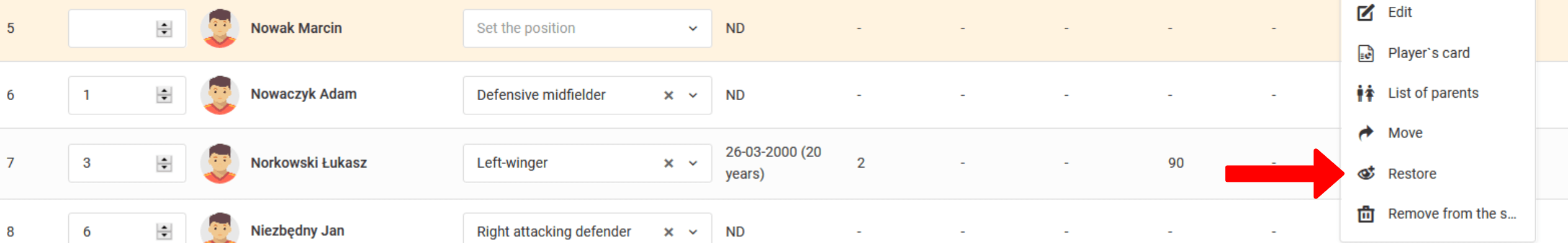 The hiding function is used to hide a player on lists such as line-up, attendance list, match line-up, etc. Hidden players will not disappear from the contribution list for example: the fees already paid build up the total financial balance of the team. Naturally, a hidden player is specially marked in the contribution list. If there is a case that a player has moved to another team (senior team) and from now on he will pay his contributions to the senior team, he has to be excluded from the contributions of the younger team. You can find out how to do this in the section related to contributions. Remember that you can restore a hidden player at any time. To do this, check the checkbox "show hidden" and click on the "restore" option in the menu of the selected player.