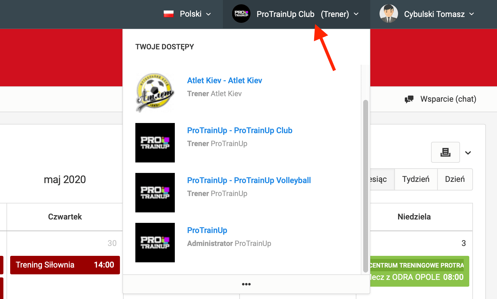 System daje możliwość pełnienia więcej niż jednej roli. Oznacza to, że wykorzystując jeden login i hasło, masz możliwość korzystania z systemu jako: rodzic, zawodnik, trener, koordynator czy też administrator główny klubu.  Aby przełączać się miedzy posiadanymi rolami, należy kliknąć w prawym górnym rogu przycisk ze swoją aktualnie wczytaną rolą. Następnym krokiem jest wybranie roli, którą chcesz wczytać jako aktywną. Zmiana roli może skutkować zmianę poziomu dostępu do danych w systemie. Bardziej szczegółową listę ról znajdziesz w lewym menu w zakładce "dostępy".