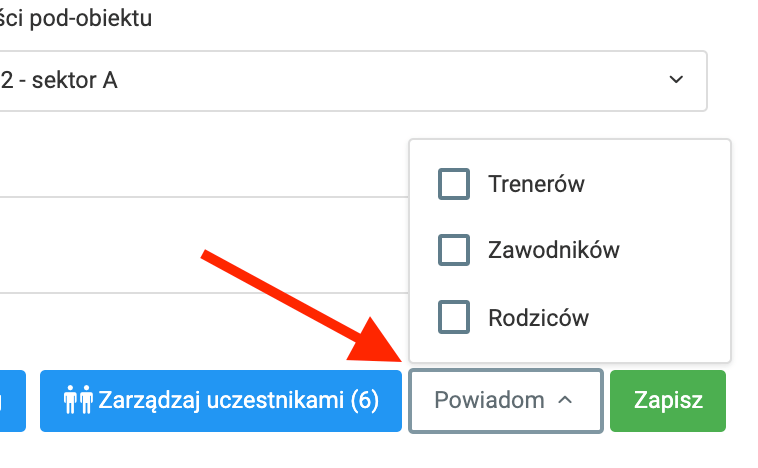 Przy okazji tworzenia treningu masz możliwość ustalenia listy uczestników treningu (zawodnicy) oraz trenerów (kadra). Zaznaczona lista zawodników będzie zbieżna z listą zawodników na liście obecności przy okazji jej sprawdzania. Lista trenerów zaznaczonych jako kadra danego treningu, będzie widoczna m.in. na konspekcie. Z tego też miejsca masz również możliwość powoływania jednorazowo zawodnika z innej drużyny na planowany trening. Powiadomienie uczestników o treningu opiera się na wyborze grup użytkowników, do których takowe ma zostać wysłane. Pojawi się ono zarówno na aplikacji mobilnej, jak i w wersji online systemu.